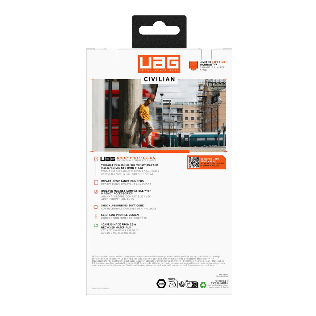 Discover the Civilian Case for the Samsung Galaxy S26 Ultra - designed for those who value style, durability, and function. Slimmer than our previous generation, this case incorporates a magnet module for compatibility with magnetic accessories and wireless charging. Built with triple-shot overmold construction and a hex cushioning core, the Civilian case provides 20 ft (6 meters) of drop protection, ensuring your phone stays safe from drops and daily wear. The raised edge shields your screen from scratches and impacts, while the anti-slip grip keeps your device secure in hand. Enjoy the crisp, responsive feel of oversized tactile buttons for easy control on the go.